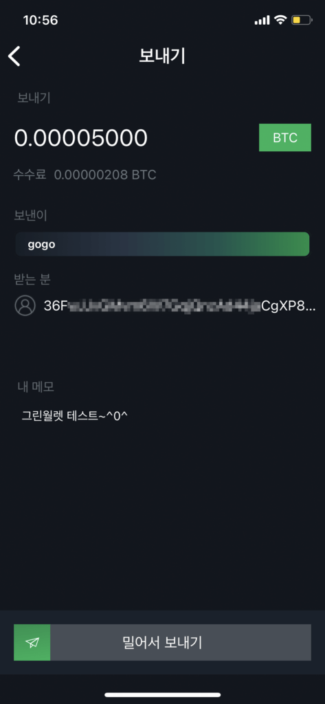 ‘보내는 중’ 밑에 0.00000000라고 써있는 숫자를 눌러서 송금하고 싶은 BTC 만큼 입력하면되. (미국달러 가치로 보내고 싶으면, USD초록색 BTC 버튼을 누른뒤 원하는 USD 금액을 입력하면되)